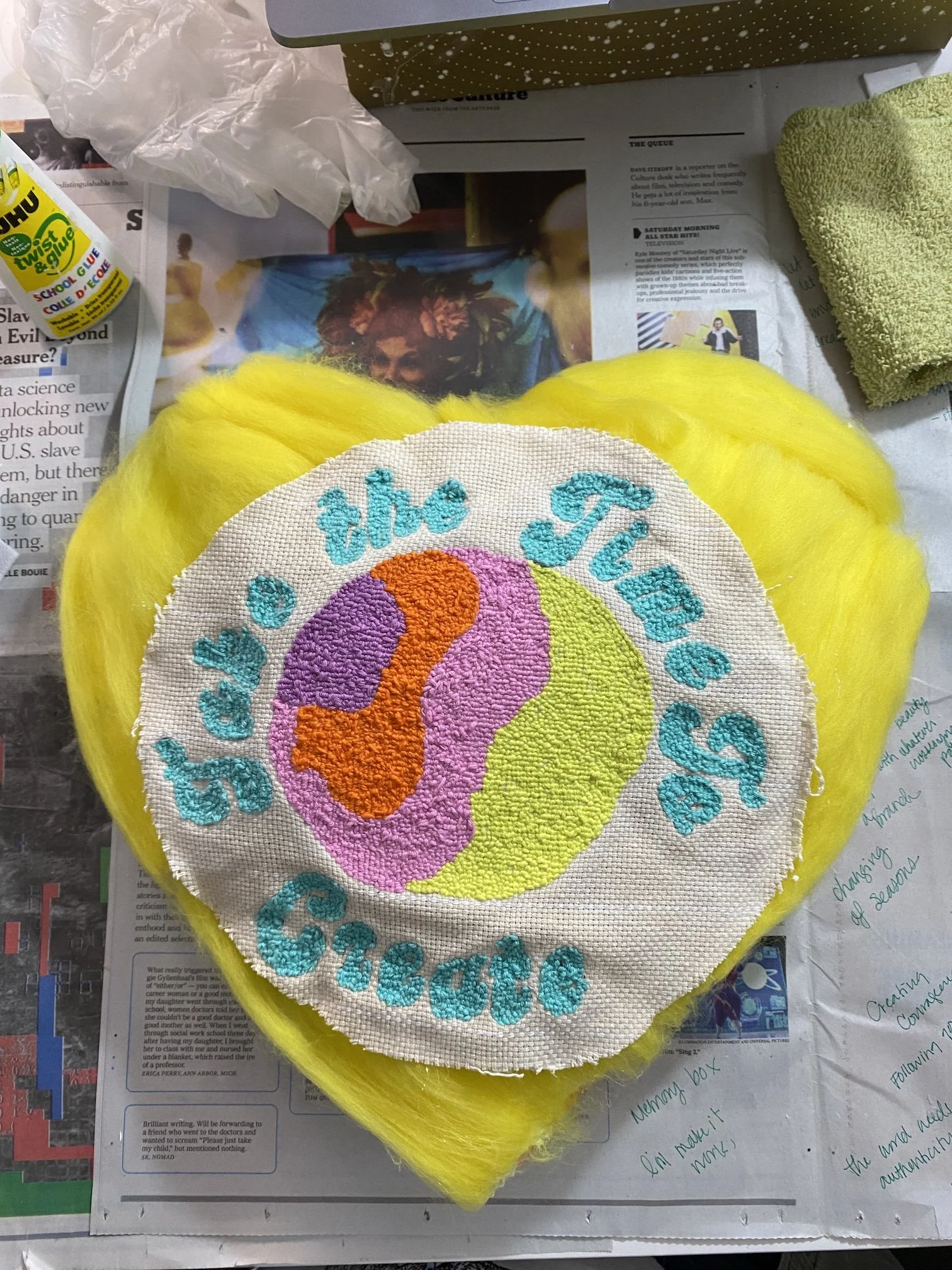 It still needed something else. As I was looking through my personal art supplies, I came across a few punch-needle textiles that I made last year. That’s where I found “Take The Time To Create.” I loved the colors, the message, and It complemented the yellow background.